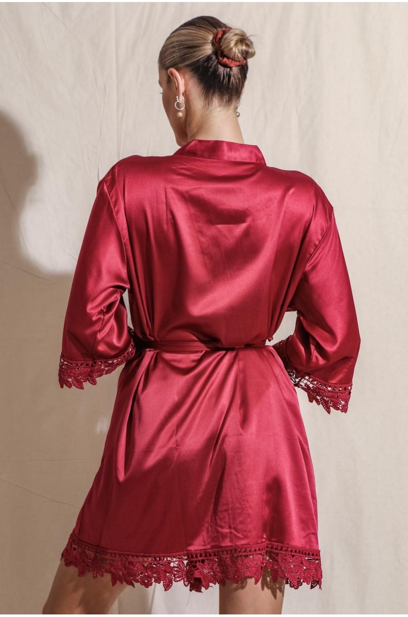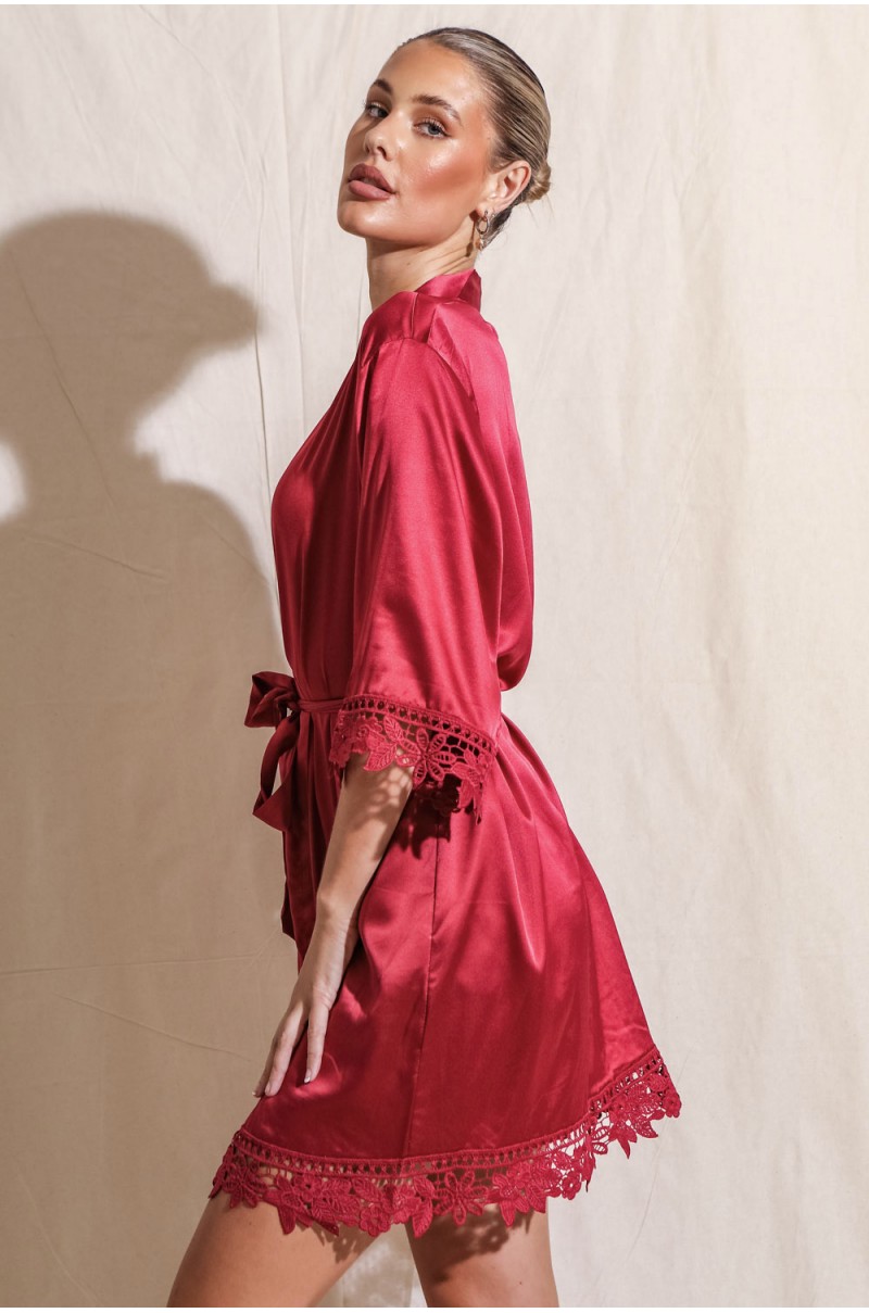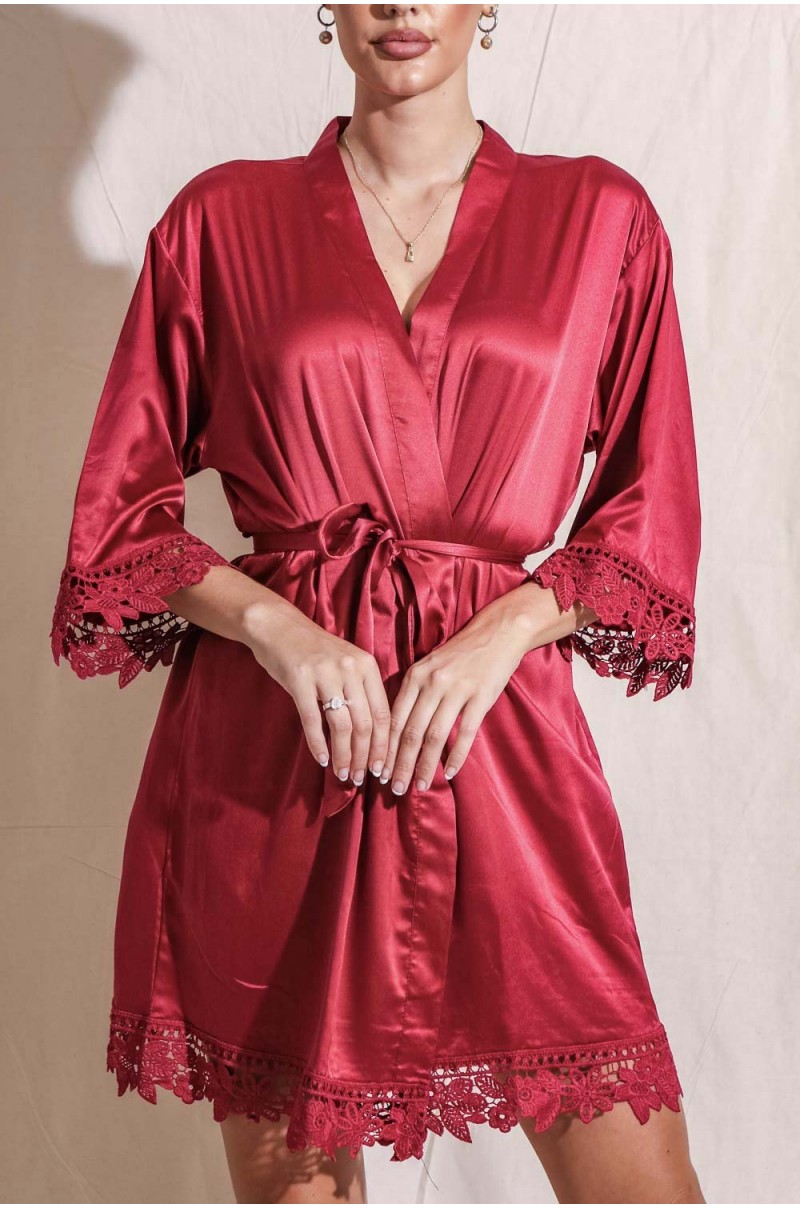Presentamos a Lirio Roja, nuestra bata de dama de honor de satén suave y sedoso con un hermoso brillo y detalles de encaje floral a lo largo del dobadillo y las mangas.