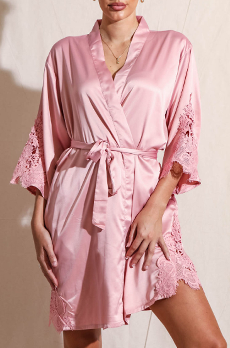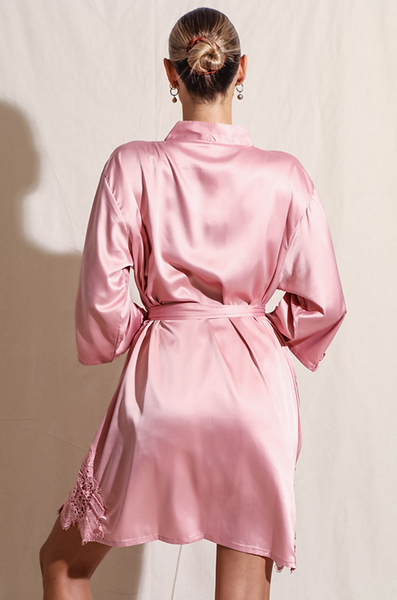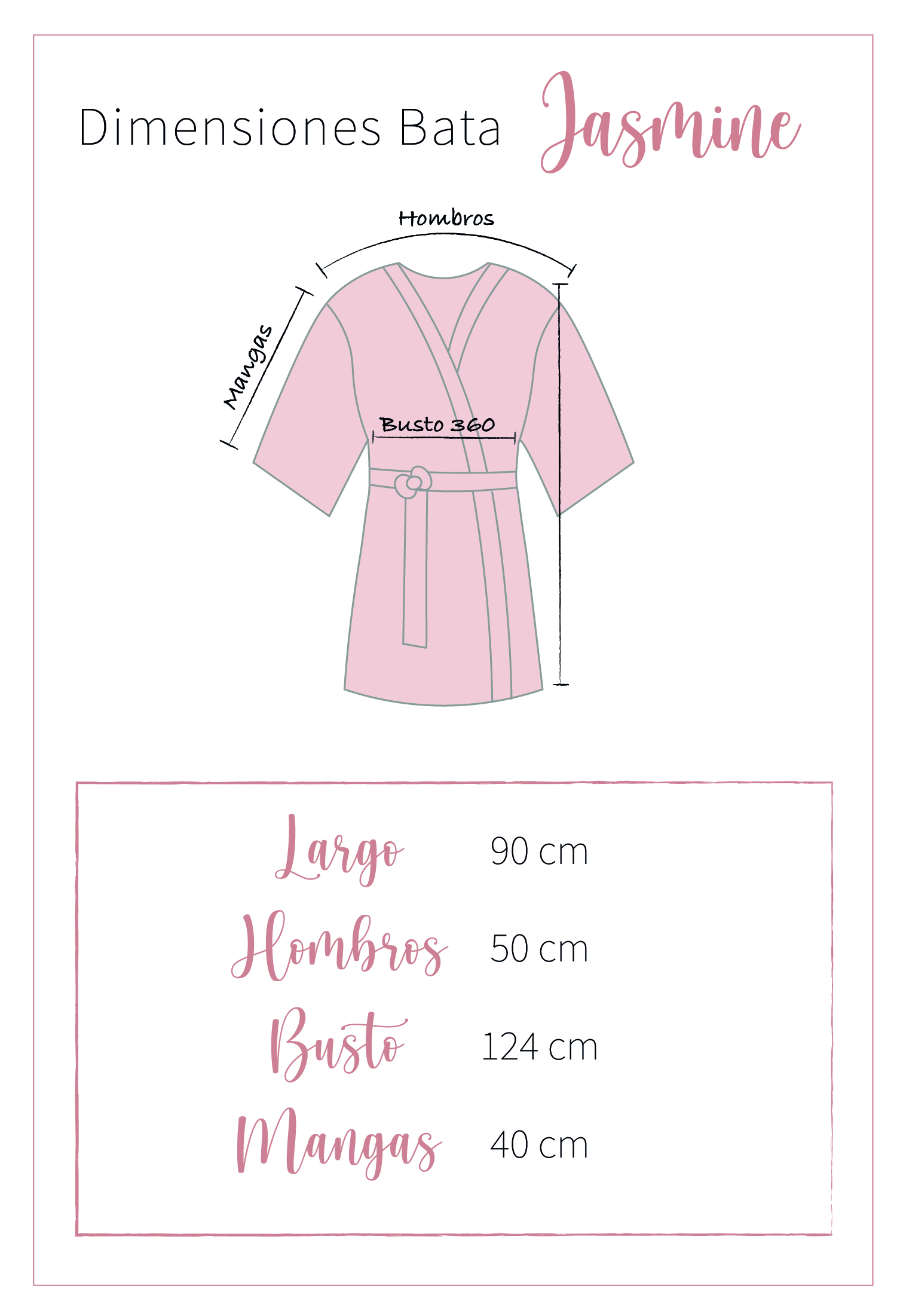 Jasmine es una bata de textura satinada y suave al tacto, con encaje triangular en mangas y abertura lateral.