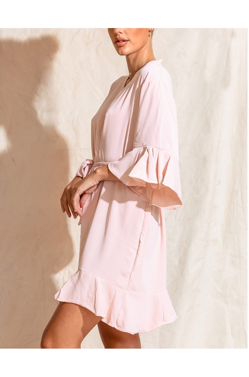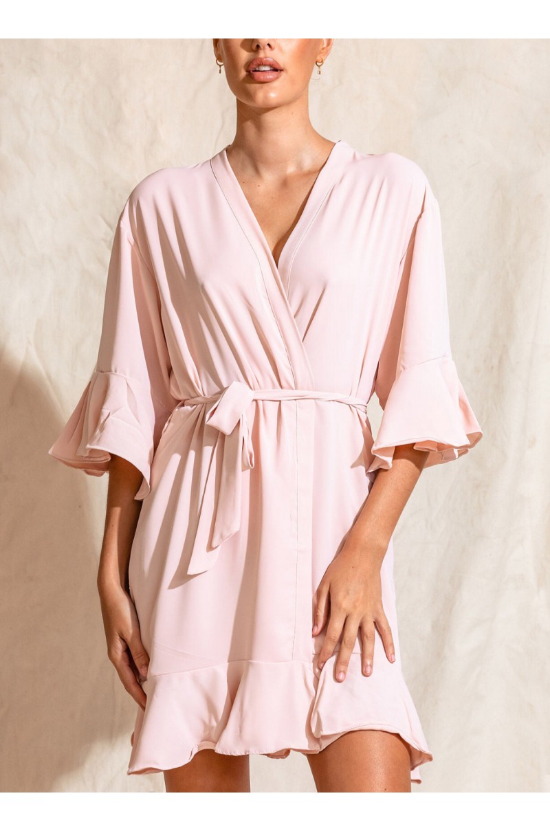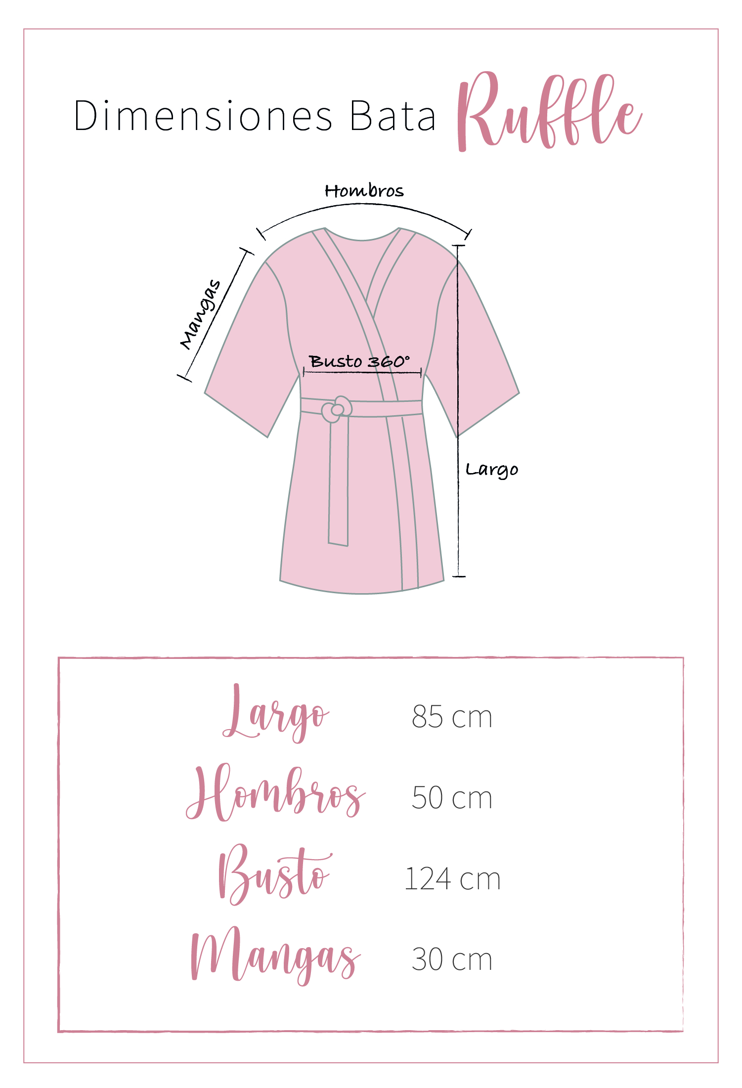 Presentamos Ruffle Palo Rosa, nuestra bata de dama de honor con volantes en mangas y dobladillo confeccionada con una tela cómoda y fresca con apariencia mate.