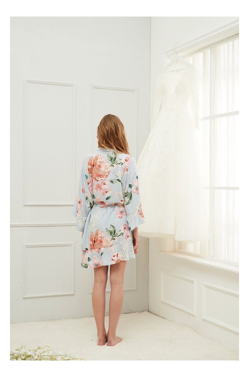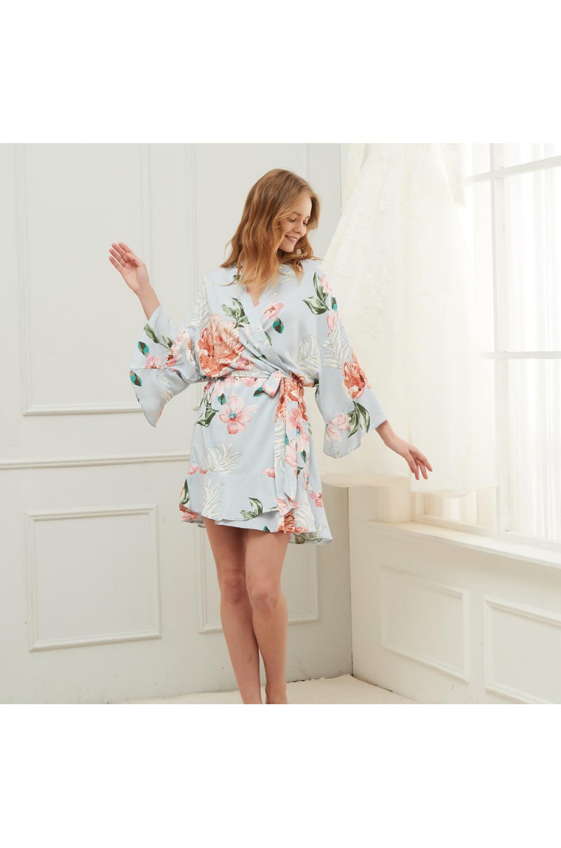 Nuestra bata Peonía es una bata de diseño floral con volantes en las mangas y el dobladillo. Tiene textura de algodón, y la tela es opaca y suave.